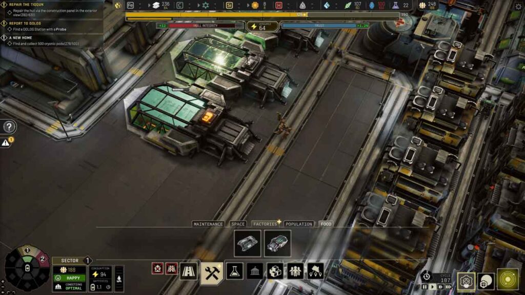 Ngunit kahit na sa dulo kapag ang mga tren at drone ay umuusad sa ibabaw, maraming mga delivery robot sa kalsada na hindi nakakapagod sa mga mata. Ang user interface ng laro ay idinisenyo nang napakalinis at madali, at ang pag-unawa nito ay intuitive, at sa kadahilanang ito, hindi mo mararamdaman na kulang ito. Nakasentro ang gameplay sa pagpapanatiling buhay ng istasyon sa pamamagitan ng pangangalap ng mapagkukunan, pagkuha, at pagtatayo, habang sinusubukang panatilihing masaya at mahusay ang mga kawani ng istasyon sa lahat ng oras. Ang Tiqqun space station ay may anim na pangunahing compartment, gayunpaman, limitado ka sa isang compartment para magsimula, at ito ang unang bahagi ng laro at kung saan ito kumukuha ng pinakamaraming paghahambing sa mga elemento ng Frostpunk.