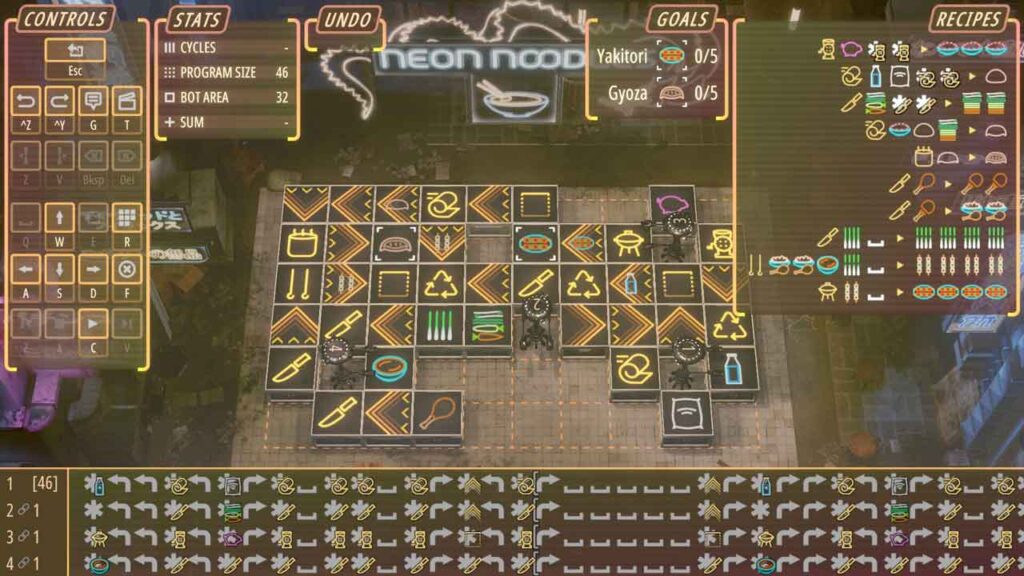 Mahilig ka bang magluto? Gusto mo ba ng programming? Gusto mo ba ng dystopian futures kung saan nagprogram ka ng mga robot para magluto ng pagkain!? Pagkatapos ay Neon Noodles ang laro para sa iyo. Ito ay talagang nakakahumaling na makahanap ng isang mahusay na solusyon sa programming upang makumpleto ang mga recipe at pagkatapos ay subukang baguhin ang iyong mga programa upang magkaroon ng ilang mga cycle hangga’t maaari. Hindi pa ako nakakalaro ng maraming “mala-zach” na laro, ngunit para sa akin, ang isang ito ay talagang kapana-panabik.