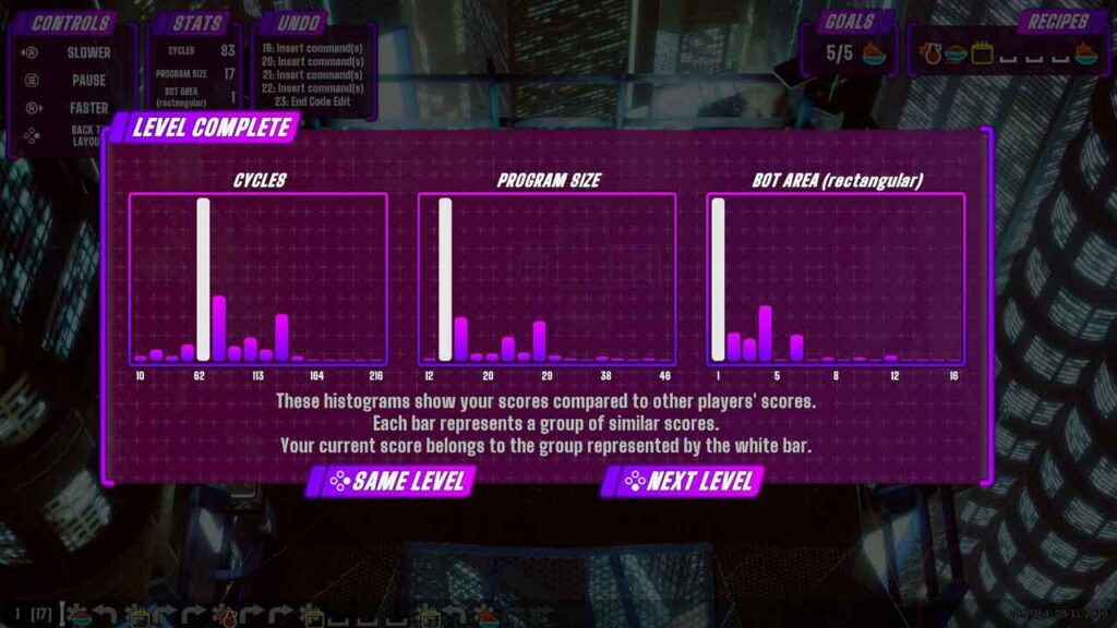 Ulitin ang lahat ng mga aksyon hanggang sa makumpleto mo ang mga layunin nang walang anumang mga error, pagkatapos ay makumpleto ang antas at maaari kang magpatuloy sa susunod. Sa dulo ng bawat antas, maaari mong suriin kung gaano kahusay ang ginawa mo laban sa ibang mga tao sa antas na iyon. Ipinapakita ng mga histogram ang iyong kasalukuyang marka kumpara sa iba pang mga manlalaro, kabilang ang bilang ng mga cycle, ang laki ng programa, at ang lugar ng robot. Ako ay medyo mapili tungkol sa mga larong puzzle o mala-zach na mga pamagat, at ang isang ito ay nabighani ako. Ang mga mekaniko ay matalino at gagantimpalaan ka kapag nakahanap ka ng solusyon. Hindi ka nito masyadong itinulak at ang mga puzzle ay sapat na hamon sa simula.