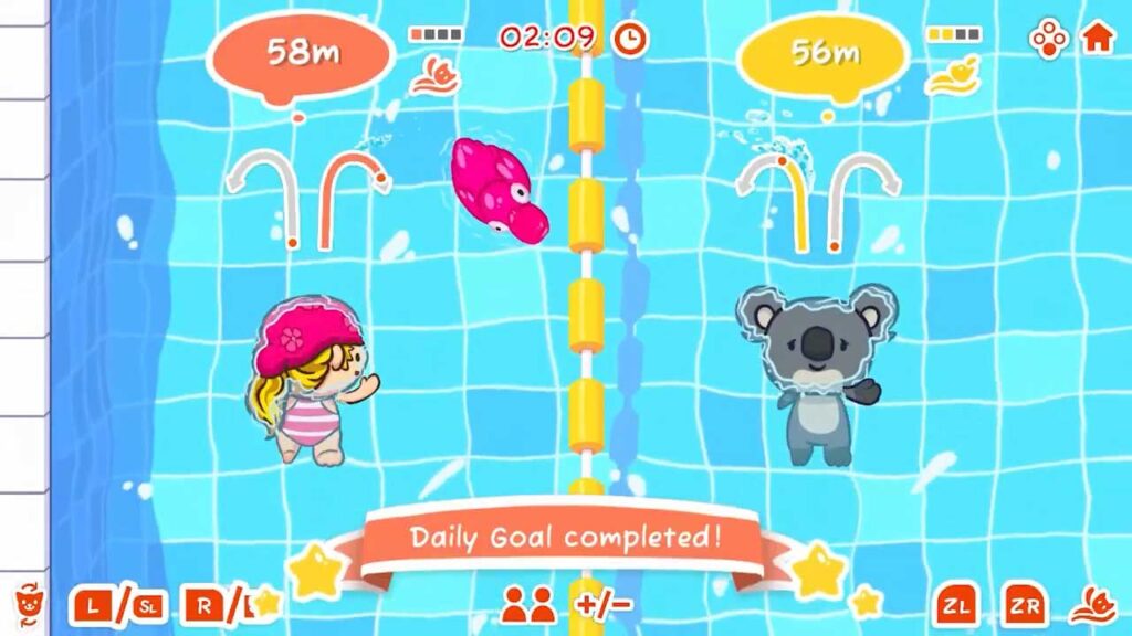 Tulad ng sinabi ko, Sport & Fun: Swimming ay isang swimming game, kaya kailangan mo lang gamitin ang joy-cons para lumangoy, na maaaring nakakainip gawin, ngunit ito ay isang mahusay na ehersisyo. Upang maglaro ng laro kailangan mong piliin muna ang iyong karakter at karaniwang maaari mong baguhin ang iyong karakter: maaari kang maging isang aso o isang pusa, maaari kang maging isang koala, maaari kang maging isang pating. O kung ikaw ay lalaki o babae. Ang disenyo ng hitsura ng lahat ng mga character na ito ay napakahusay at kaibig-ibig at lahat sila ay may istilong cartoon, na nagdaragdag naman ng isang espesyal na kagandahan sa gameplay. Bilang karagdagan, ang isang nakakarelaks na soundtrack ay nilalaro sa background, na nagbibigay sa iyo ng napakagandang pakiramdam habang lumalangoy.