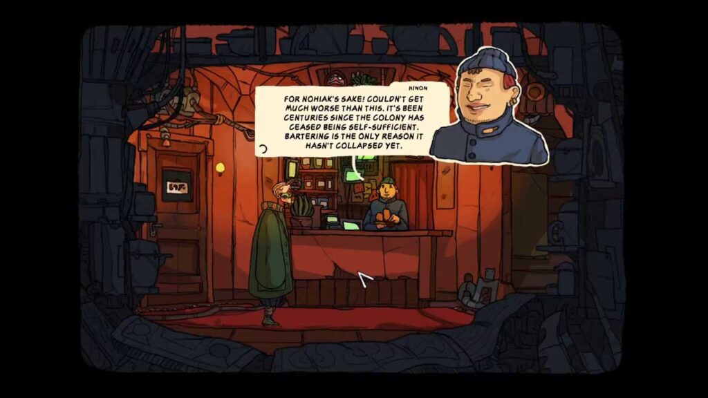 Sa pangkalahatan, pinapaboran ng Universe For Sale ang pagkukuwento, na may maraming diyalogo at teksto na sumusuporta sa buong mundo ng kuwento, ang ilang mga diyalogo ay may mga salita, at iba’t ibang mga tagubilin sa kuwento ang kasama sa mga diyalogo kaya kailangan mong bigyang pansin, kung hindi, karaniwan para sa kanila makaalis ka at hindi ka makaka-move forward. Gayunpaman, dahil ang laro ay hindi nagha-highlight ng mga interactive na elemento, paminsan-minsan ay hindi mo sinasadyang mag-click sa isang NPC upang magkaroon ng isang pag-uusap dahil sa paggalaw, karaniwang ang mga pag-uusap ay paulit-ulit at hindi maaaring balewalain, na Ito ay napakalungkot.