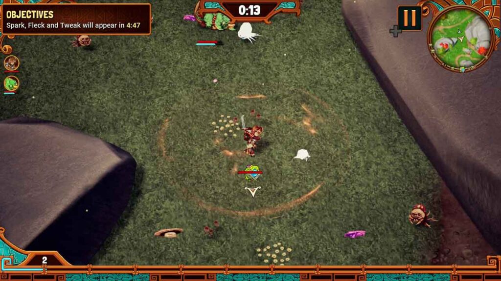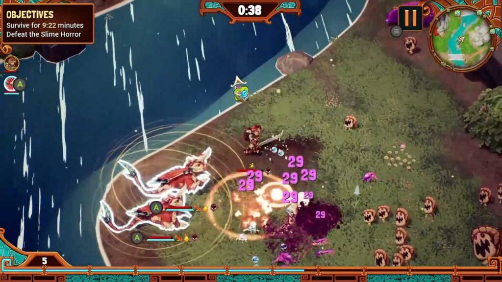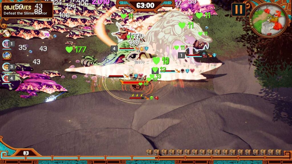 Ang bawat halimaw ay may sariling natatanging “ultimate” na pattern ng pag-atake at pinapahusay/pinapahina ang kalaban o mga kakampi. Aatakehin ka ng mga kaaway nang maramihan mula sa lahat ng direksyon. Minsan, depende sa mode ng laro, makakatagpo ka ng isang boss fight, ang boss fight na ito sa endless mode ay nagre-reset ng mga chest na makukuha mo habang tumatakbo at nakikipaglaban sa paligid ng mapa. Oo, ang laro ay may mga sandali ng purong turret style na gameplay kung saan nakatayo ka lang doon at walang ginagawa. Ngunit ang ilan sa mga halimaw sa iyong koponan ay susubukan kang pigilan sa paggawa nito, tulad ng pagbagsak ng mga “healing” heart saanman sila maglakbay.